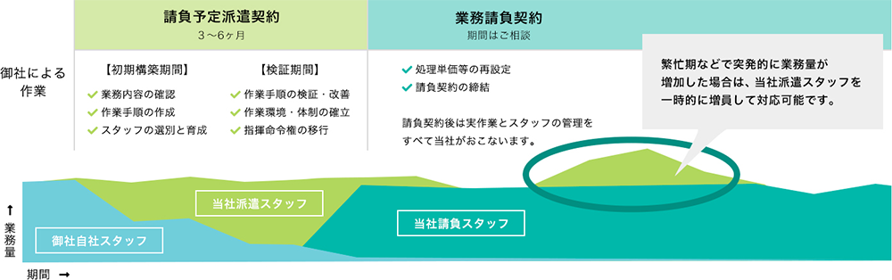 ご要望の業務を当初の数ヶ月間は「人材派遣」として運用し、作業の手順化や業務体制の確立を行います。それ以降は「業務請負」として、ご要望の業務をスタッフの手配・管理なども含めて当社が丸ごとお引き受けします。