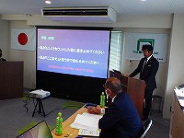 令和3年4月24日、本社大会議室にて「第33期昇任者研修・拡大会議」を開催しました。今回は、新型コロナウィルス感染拡大防止のため、部門責任者や昇任者など参加者を最小限に減らし、消毒や一定時間毎に換気するなど徹底した対策を講じた上で開催しました。