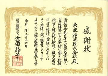 令和元年に発生した台風15号及び19号による災害により、お亡くなりになられた方々に謹んで哀悼の意を表しますとともに、被災された方々に心からお見舞い申し上げます。弊社は台風被害に対し、復旧支援のための救援物資を被災地に輸送させて頂きました。今般、その救援活動に対して関東運輸局長より感謝状を頂きました。 今後も国や地方公共団体からの要請に応じ、少しでもお役に立てるべく活動して参ります。被災された方々、地域の一日も早い復旧、復興を願っております。