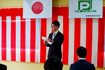 続いて、事業統括本部長より「皆さんの頑張りが、今後の東亜物流の支えになると思います。失敗を恐れずに挑戦してください。」との祝辞を頂きました。その後、一人一人に社員証が授与され、最後に新入社員代表者が「東亜物流の一員として、仕事を早く覚えて活躍できる様に努力いたします。」と力強い答辞を述べ、気持ちも新たに社会人としての第一歩を踏み出しました。