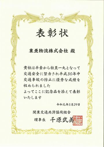 令和元年5月29日、関東交通共済協同組合より昨年1年間にわたりフォークリフト事故ゼロであった事を受け、「平成30年事故防止優良組合員表彰」が授与されました。各拠点にフォークリフト(合計30台)があり、安全操作に配慮し活動を行った結果、評価されました。今後も事故防止に社員一丸となり、より一層の努力をして参ります。