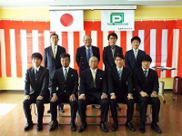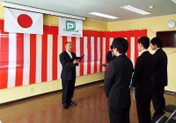 「私から、入社にあたりまして3つのお願いがあります。新入社員はまず ① 明るくげんきであること ② 約束(ルール)をまもる ③ いわれた事をミスなくこなす 基本はこの3点ですが、当社社員の基本姿勢として何事に対しても前を向いて挑戦、チャレンジしていただきたい。挑戦、チャレンジする心から進化が始まりそれが社訓の一つ創意工夫に繋がります。今は、不安と期待とが有ると思いますが、1日も早く社風に馴染んで頂いて、どうか自信を持って自己実現へと結びつけて欲しいと思います。
