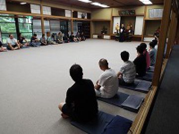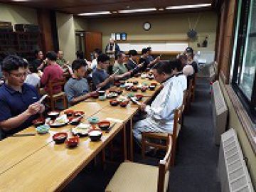 1日目は、本社よりバスにて出発し、研修所到着までの車中「事故防止について」映像を交えた講義、研修所では常務取締役より「管理職としての業務の進め方やコミュニケーション話術」などの講義を行った後、坐禅がスタートしました。坐禅中、精神統一のため和尚様より警策(けいさく)を頂きました。夕食は作法にのっとり心得を唱和し、神仏に感謝しながら精進料理を頂いた後、2回目の坐禅となりました。坐禅後、就寝の時間まで仲間と語り合い、お互いの今後の健闘を称え合いました。