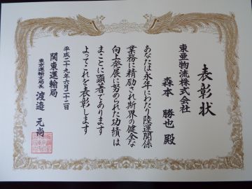 ニュース - 関東運輸局から表彰されました|東亜物流株式会社