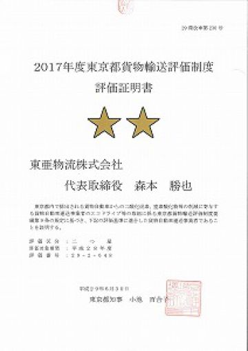 弊社はこのたび、東京都環境局が主管する「貨物輸送評価制度」において、当社の取り組みと燃費実績に対し、4年連続で『星2つ』の評価を頂きました。当社が燃費向上の啓蒙・教育、データの記録・分析とそのフィードバックを長年継続したことが、この評価に繋がりました。物流品質の向上を目指す当社と致しましては、更なる品質の向上と改善を目指し、全社一丸となって努力して参ります。
