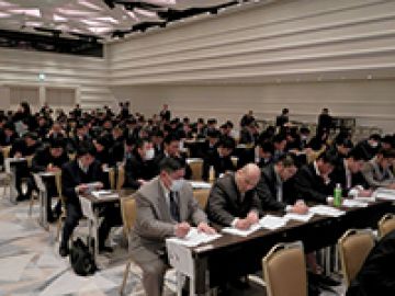 舞浜のヒルトン東京ベイに場所を移し、社長からの本年の経営基本方針の説明を含めた訓示の後、各部門の優秀社員への表彰、ならびに今春入社予定の新卒内定者6名の紹介が行われました。