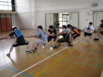 集合研修の後で近隣の小学校へ全員で移動、体力テストと団体競技を行いました。