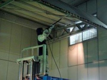 次に高枝切りバサミで巣を落として一旦避難し、ハチの生き残りがいないことを確認して、高圧洗浄機で水をかけ、洗い流します。