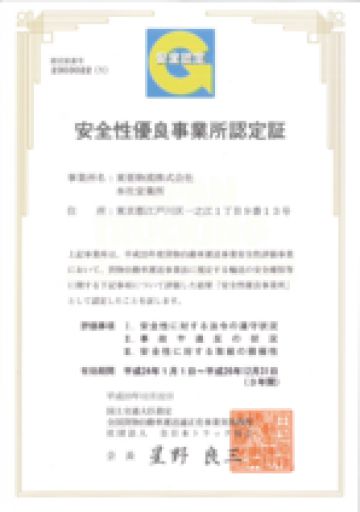 平成23年12月26日、全国貨物自動車運送適正化事業実施機関である全日本トラック協会より、弊社本社営業所、および西東京支店が安全性優良事業所に認定されました。