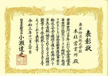 令和3年11月30日、関東運輸局より「安全性優良事業所 関東運輸局長表彰」を拝受致しました。この賞は、安全性優良事業所認定(通称:Gマーク)を10年以上継続の上、更なる安全対策を講じた事を評価する表彰です。この度の表彰を機に、これまで以上に安全運転業務に邁進致します。