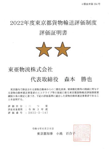 東京都環境局による「令和3年度貨物輸送評価制度」において、