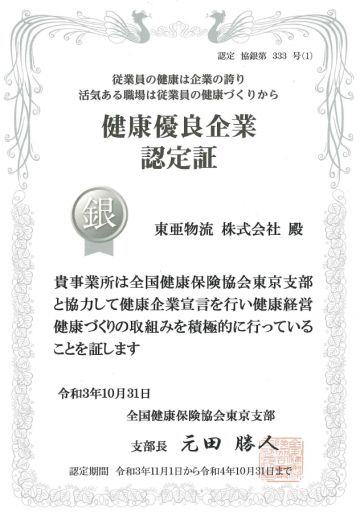 令和3年10月31日、全国健康保険協会東京支部より、健康経営健康づくりの取組みを積極的に行っている事が評価され、健康優良企業「銀の認定」を更新する事ができました。当社は今年の3月に健康経営優良法人2021の認証を取得しており、従業員の健康を保持する事が仕事のやりがいに繋がり、引いてはお客様への良質なサービスに繋がると信じ、社員の健康づくりへの取り組みを推進しています。今後も、認定の更新は勿論のこと、戦略的に健康経営を実施して参ります。
