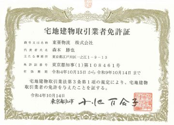 令和4年10月14日付にて、東京都知事による宅地建物取引業の営業免許を取得いたしました。弊社は、物流業を営んでおりますが、その中の3PL事業は不動産の活用と切り離せない関係にあります。昨今、先行きが不透明でありながら、スピードが常に求められる経済情勢に於いて、よりスピーディに情報を集め、お客様のニーズに素早くお答えする事を目的として免許取得をいたしました。今後、弊社の物流業の付加価値として、不動産事業を推進して参りますのでどうぞよろしくお願い申し上げます。