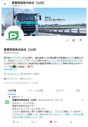 令和4年11月1日より、東亜物流株式会社の公式Twitterアカウントを作成しました。https://twitter.com/toalineofficial 弊社での情報発信は従来ホームページのみでしたが、今後より広くお客様をはじめ、地域社会の皆様に弊社の事を知って頂く為の広報戦略の一環として、後発ながらSNSの活用を開始しました。まだまだ始めたばかりですが、今後有用な情報も発信したいと思いますので、どうぞよろしくお願いいたします。