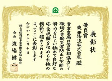 令和4年11月10日陸上貨物運送事業労働災害防止協会(陸災防)が毎年開催する全国大会に於いて、安全衛生表彰の「優良賞」を受賞しました。全国で約6万社あると言われている運送会社の中から、本大会で「優良賞」を受賞したのは11社で、東京都からは当社のみが受賞した大変名誉ある賞です。この結果におごる事なく、当社は今後も社員とその家族を守るべく、安全衛生について、積極的に推進して参ります。
