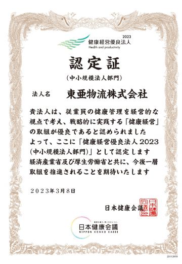 令和5年3月8日、経済産業省より、健康づくりの取組みを積極的に行っている事が評価され、「健康経営優良法人2023(中小規模法人部門)」の認定を受けました。当社は令和2年に本認定を取得し、今回で2回目の更新となります。弊社は今後も引き続き、働き方改革を含めた様々な取り組みを行い、従業員の健康を増進させる事で、求職者やお客様から選ばれる企業になれるように努めて参ります。