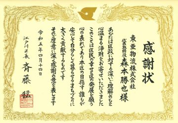 令和5年4月14日弊社が本社を構える江戸川区への区政の発展に貢献する為、一昨年・昨年に引き続き本年もご寄付をさせて頂きました。また、斉藤区長より直々に感謝状を拝受致しました。斉藤区長が目指されている「誰もが安心して自分らしく暮らせるまちづくり」は、弊社の経営理念である「顧客満足=会社発展=社員の幸せ」に繋がる部分もあります。今後とも弊社は、地元である江戸川区に貢献する事で、社会的責任を果たしていきたいと存じます。