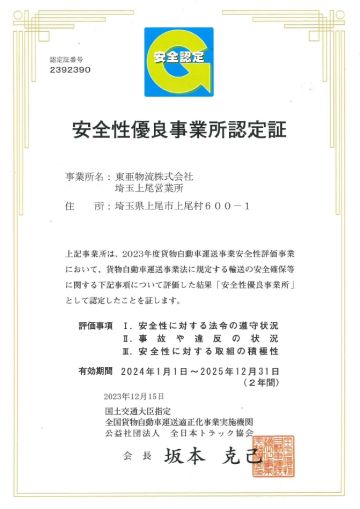 令和5年12月15日付け、当社の北関東エリアを管轄している埼玉上尾営業所においてGマークの認定を頂く事ができました。