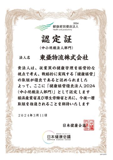 令和6年3月11日、経済産業省より、健康づくりの取組みを積極的に行っている事が評価され、「健康経営優良法人2024(中小規模法人部門)」の認定を受けました。当社は令和2年に本認定を取得し、今回で4年連続の認定となります。いよいよ2024問題と呼ばれる規制も目前に控えます。当社では働き方改革を含めた様々な取り組みを行い、従業員の健康を増進させる事で、求職者やお客様から選ばれる企業になれるように努めて参ります。
