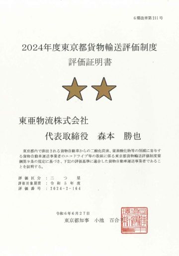 この度、東京都環境局による「令和5年度貨物輸送評価制度」において、