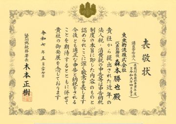 令和7年5月27日、弊社の管轄である江戸川北税務署の署長が本社へご来社頂き、優良申告法人認定による表敬状を頂戴しました。優良申告法人とは、税務調査において適正な申告と納税が行われており、また経営内容が極めて良好と判断された法人として全法人の1%未満の企業しか認定を受けていない大変栄誉ある認定だそうです。近年の申告内容並びに昨年の税務調査などの総合的な判断により本認定に至りました。今後も弊社は、事業運営を通じ地域社会に貢献するとともに、適正な申告と納税を行ってまいります。