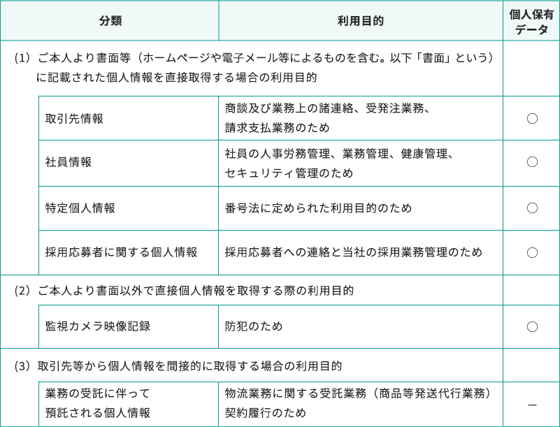 1. 個人情報は、物流、人材派遣、産業廃棄物収集運搬業務における当社の正当な事業遂行上並びに従業員の雇用、人事管理上必要な範囲に限定して、取得・利用及び提供をし、特定された利用目的の達成に必要な範囲を超えた個人情報の取扱い(目的外利用)を行いません。また、目的外利用を行わないための措置を講じます。